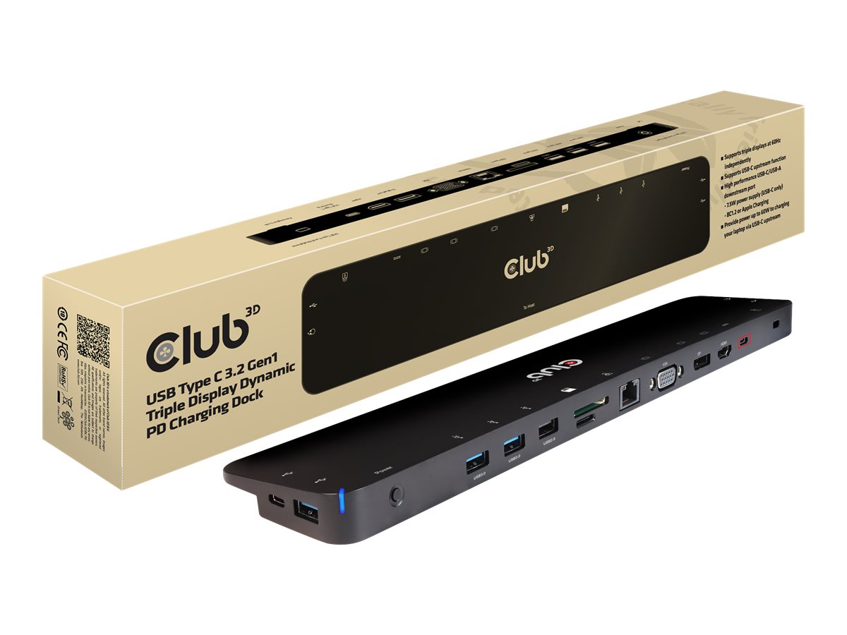 Club-3D USB Type C 3.2 Gen1 Triple Display Dynamic PD Charging Dock är en integrerad lösning som kombinerar video, data, ström, Ethernet och ljud, särskilt för frekventa resenärer. De tre olika videoportarna (HDMI, DisplayPort, VGA) låter dig njuta av 3 olika bilder eller videor på 3 olika skärmar samtidigt i MST-läge. USB Type A-portarna och USB TypeC-dataporten gör att du kan ansluta flera USB-enheter till värden. USB-laddningsporten för USB-typ C låter dig tillhandahålla ström till detta dockningsstation och kan ladda värddatorn samtidigt genom att ansluta en PD-strömadapter, utan att behöva bära dina bärbara datorer strömförsörjning.