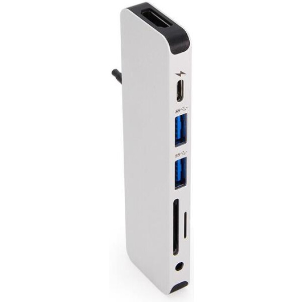 – Omvandlar en enda USB-C-port till 7 portar (HDMI, USB-C med strömförsörjning, 2 x USB 3.1, microSD, SD, ljuduttag)